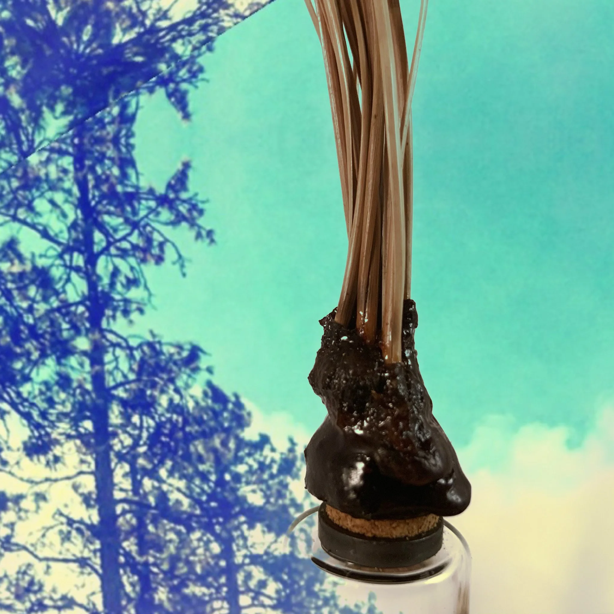 Pine needles in pine pitch surrounded by clouds and pine trees.